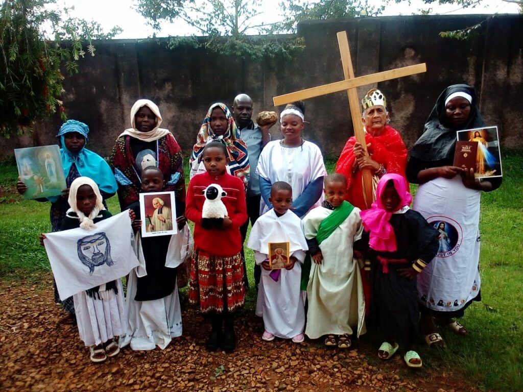 Can you identify each of the Saints pictured below? The children were robed in their favorite Saints including: St. Jude, St. Francis Cabrini, St. Jacintha, St. Faustina, St. Rose of Lima, St. Veronica, St. John Vianney, St. Agnus, St. Andrew, St. Clare, St. Josephine of Bakhita, and St. John Paul II. Can you guess who is the one holding the cross celebrating St. Helen of the Cross?